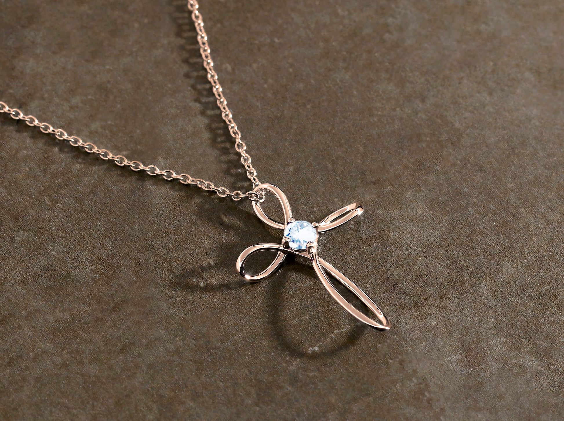 • This lovely Solitaire Twisted Criss Cross Pendant features 4mm Round Natural Aquamarine(s) in Prong Setting.